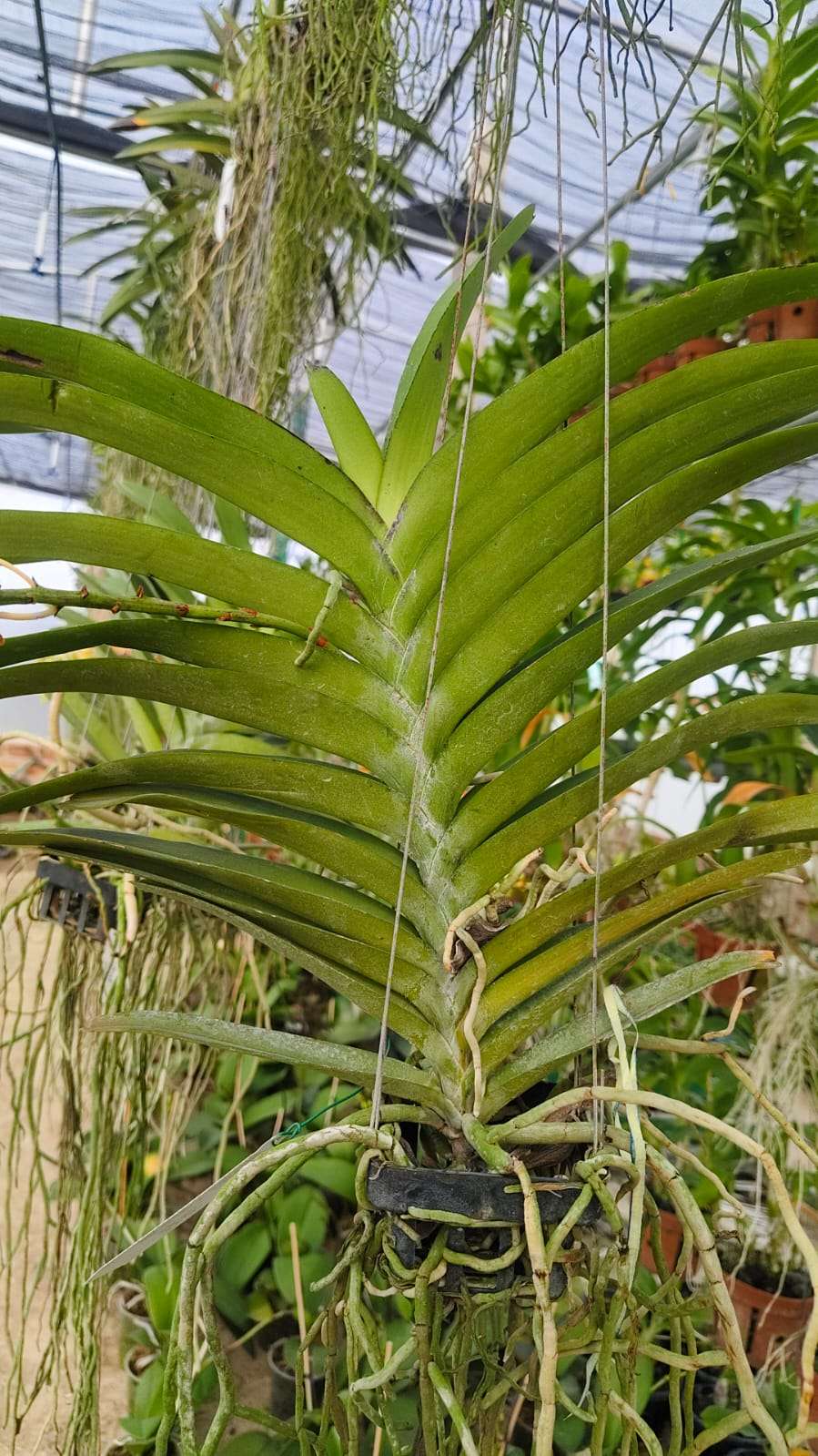 Aerides × Bangkok Sunset is a vigorous epiphytic hybrid derived from Aerides species, combining tropical beauty with robust growth. The plant has a compact to medium size with thick, leathery, strap-shaped leaves arranged alternately along a short stem. Leaves are glossy green and slightly arching, giving the plant a lush appearance even when not in bloom.