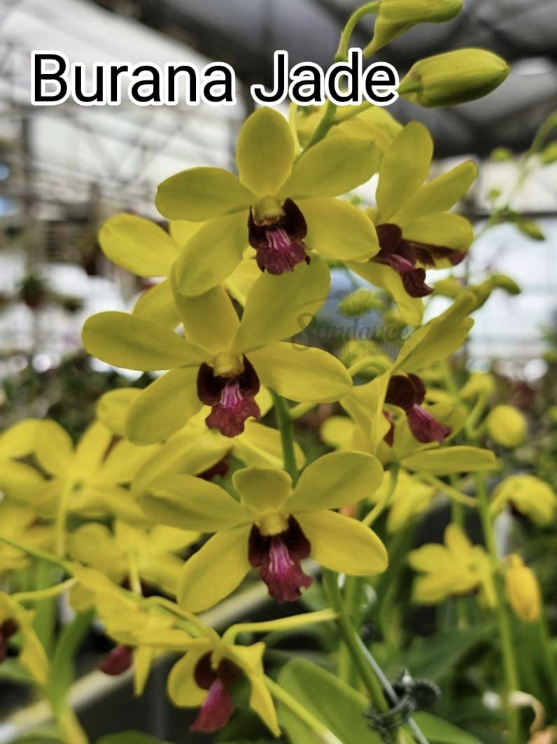 Dendrobium Burana Jade is a beautiful hybrid orchid developed by breeder P. Buranaraktham in 1996 from a cross of Dendrobium Bangkok Green × Dendrobium Burana Fancy.