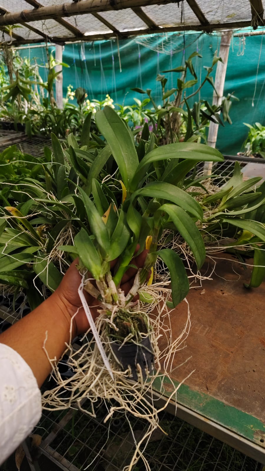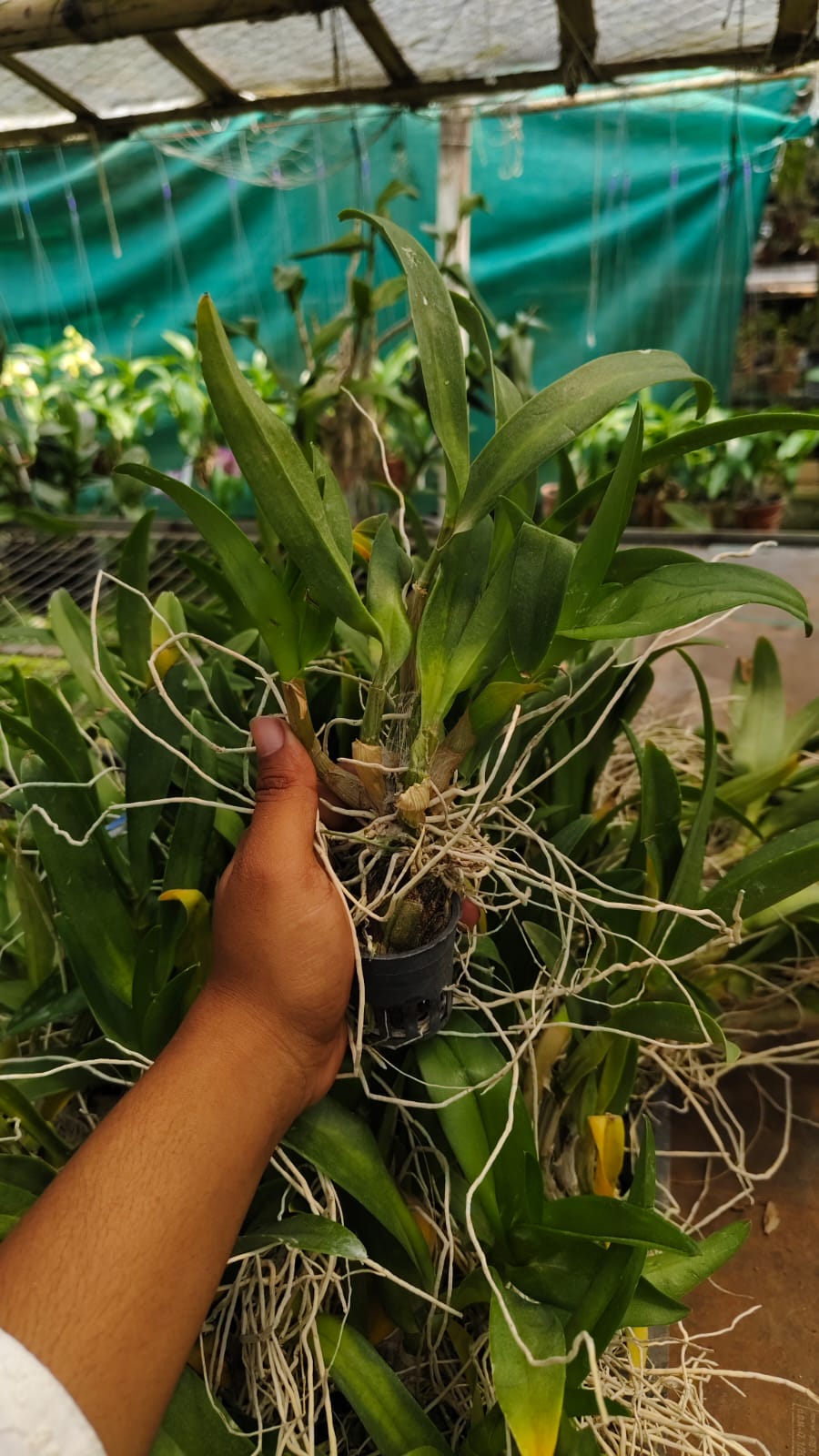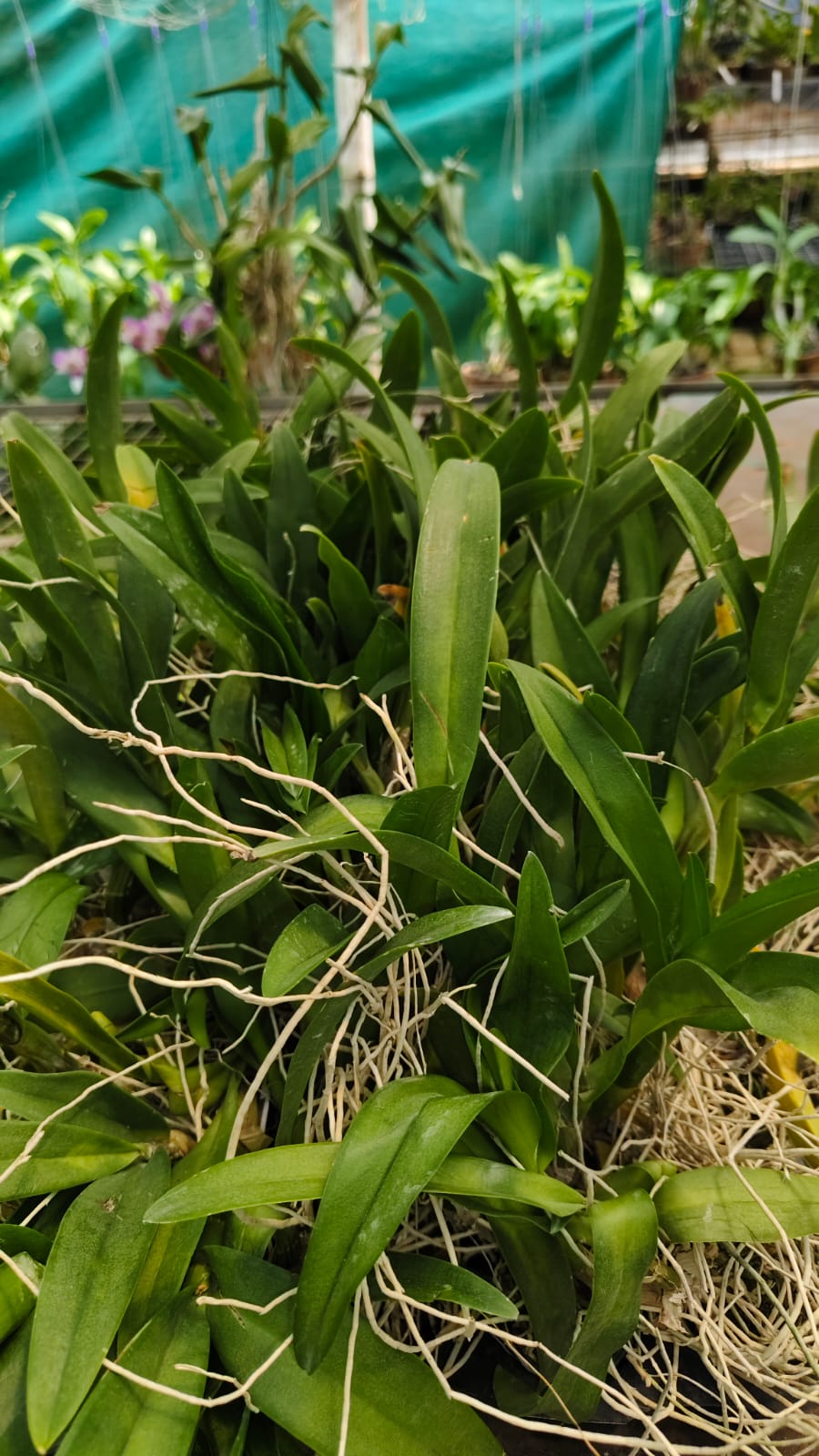 • Small, immature orchid with developing roots and thin canes