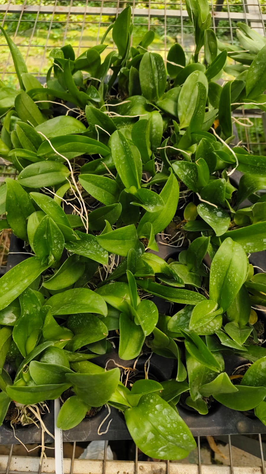 - Young plants with slender green canes (pseudobulbs)