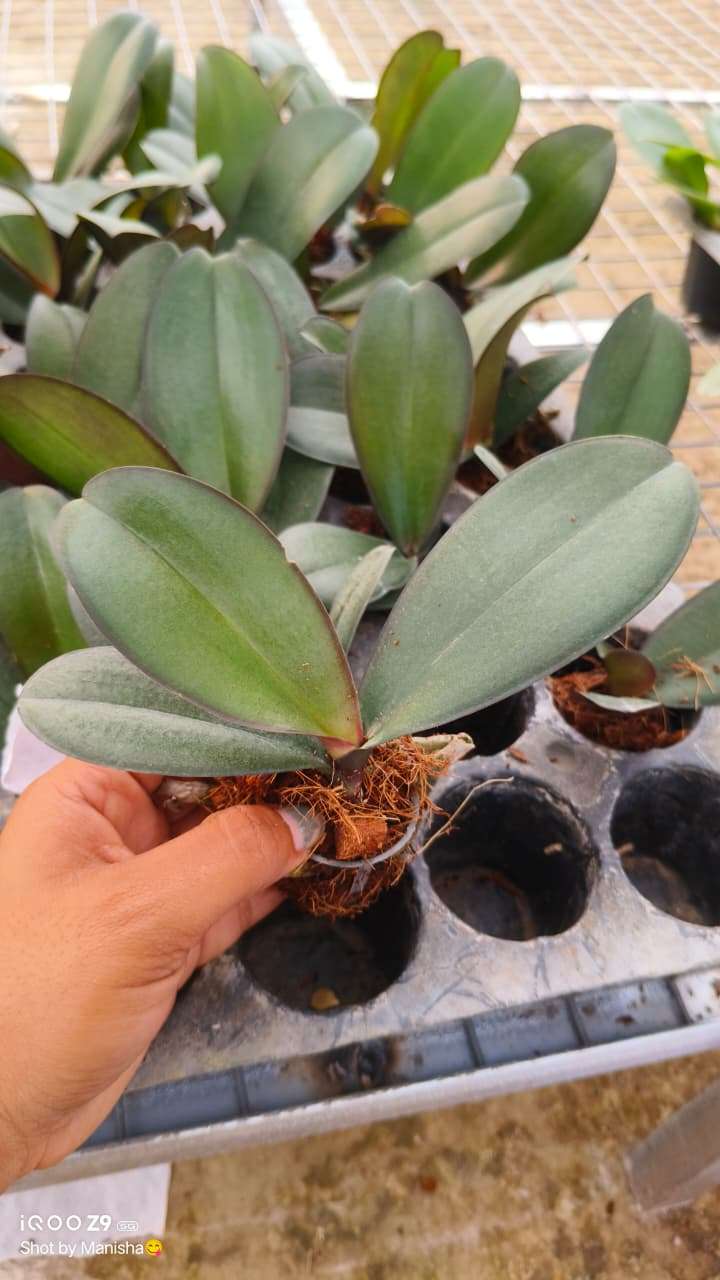 The plant forms broad, fleshy green leaves arranged in a compact rosette, typical of Phalaenopsis orchids. As a seedling, it is actively developing roots and foliage, making it ideal for growers who enjoy nurturing orchids to flowering size. With proper care, it matures into a medium-sized plant capable of producing multiple long-lasting blooms on gracefully arching spikes.