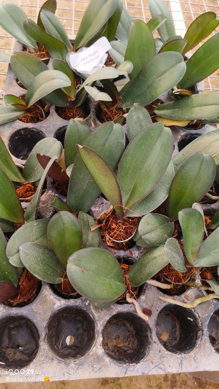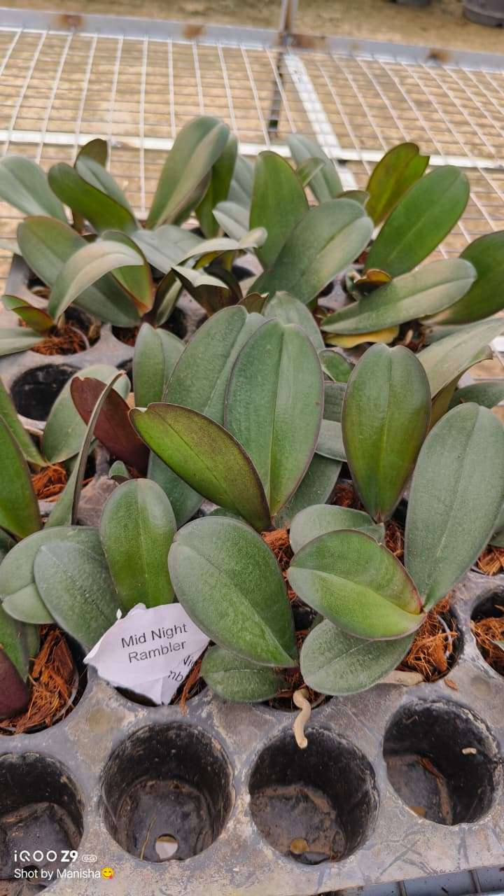 Phalaenopsis ‘Mid Night Rambler’ is a striking hybrid orchid admired for its deep, dramatic blooms and elegant arching spikes. Even at the seedling stage, this variety shows strong growth potential and promises richly colored flowers once mature. Its flowers typically display velvety maroon-purple to near-black tones with a glossy texture and a contrasting lip, creating a bold, exotic look highly prized by collectors.