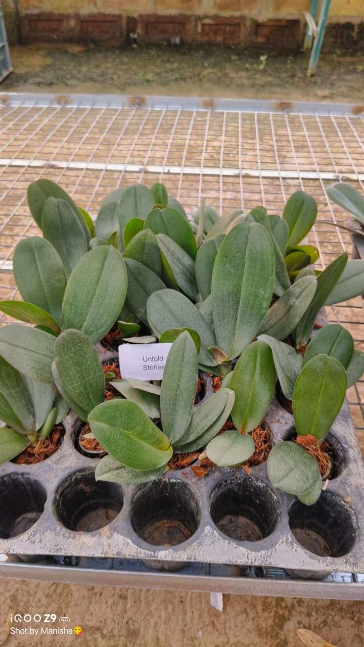 Phalaenopsis ‘Untold Stories’ is a rare and elegant hybrid moth orchid admired for its dramatic color patterns and long-lasting blooms. Even at the seedling stage, this variety shows strong potential for producing richly patterned flowers in deep plum, burgundy, violet, or pink-white combinations with speckles or veining.