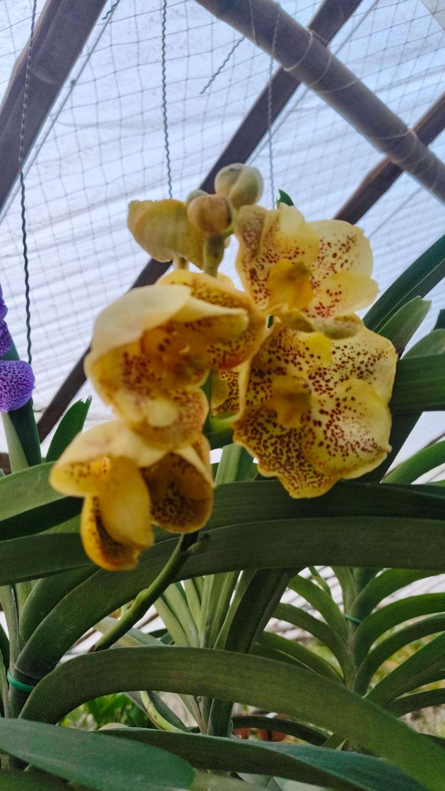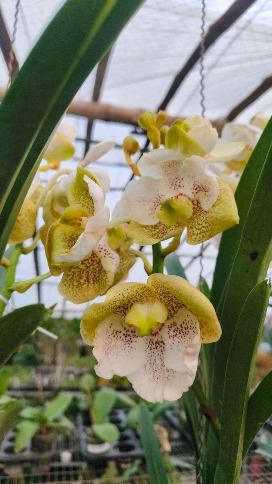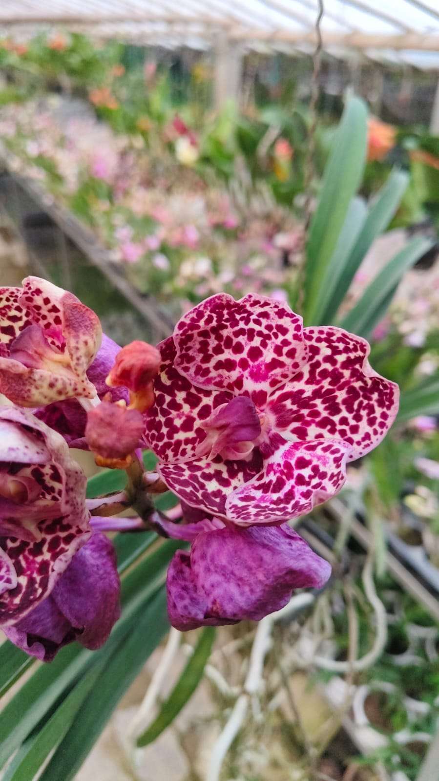 Vanda plants have a strong monopodial growth habit with thick, upright stems and robust aerial roots that absorb moisture and nutrients directly from the air. The leaves are strap-shaped, leathery, and deep green, forming a healthy crown that supports multiple flower spikes.