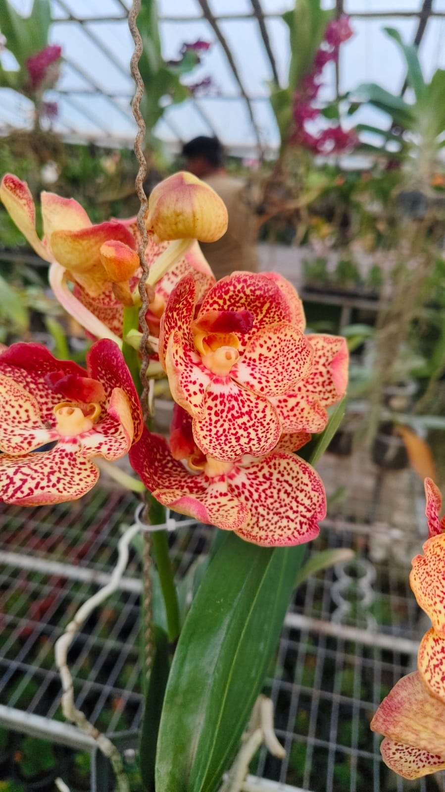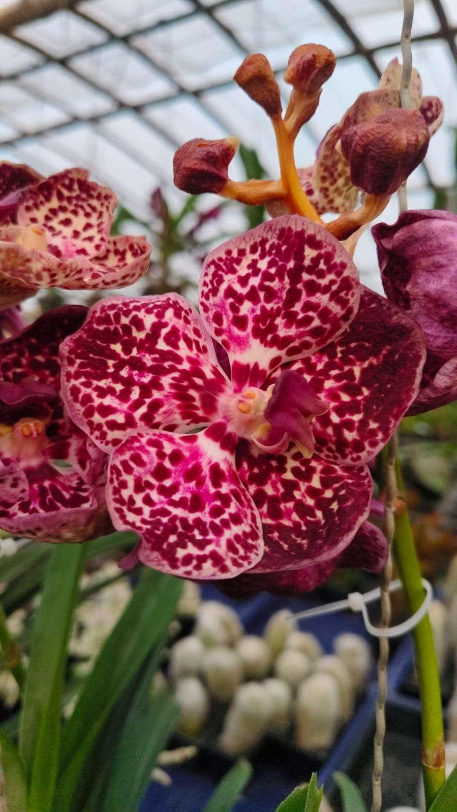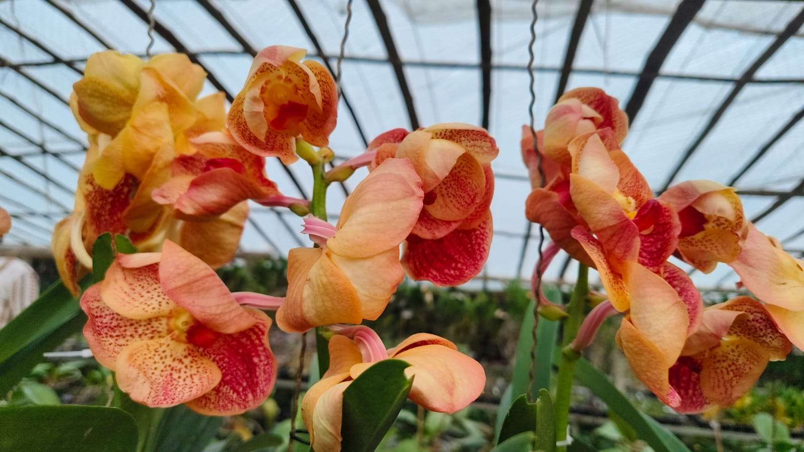 Vanda plants have a strong monopodial growth habit with thick, upright stems and robust aerial roots that absorb moisture and nutrients directly from the air. The leaves are strap-shaped, leathery, and deep green, forming a healthy crown that supports multiple flower spikes.